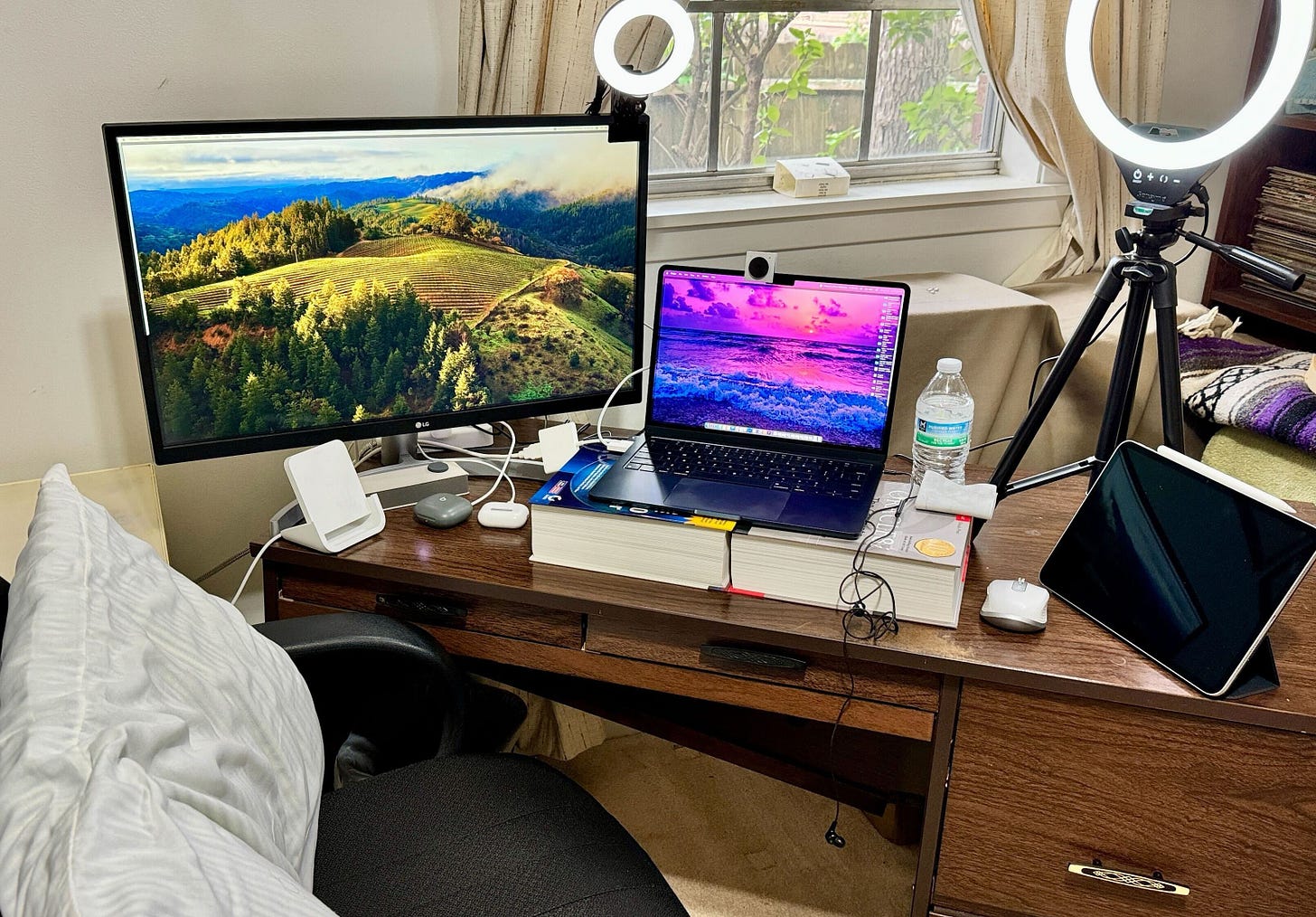 Multiple ring lights (like $20/each via Amazon) to ensure even lighting of my face, along with natural window light from the backyard. Also, using an Opal Tadpole 4K webcam, not the internal Macbook Air camera given its low quality.